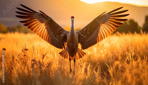 © meka, Obraz premium Sandhill crane takes flight in golden prairie at sunrise majestic scene