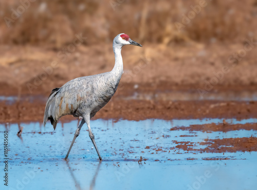 © Khaleel, Naklejka premium Sandhill crane walking with grace on water in Whitewater Draw Arizona