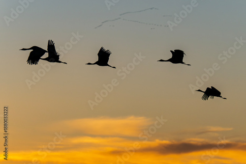 © robin, Fototapeta premium Sandhill cranes (antigone canadensis) taking flight at sunrise in Southern AZ