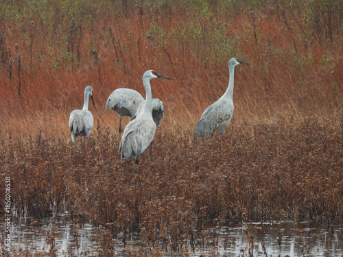 © Scenic Corner, Obraz premium Sandhill cranes, enjoying a peaceful winter day, within the wetlands of the Bombay Hook National Wildlife Refuge, Kent County, Delware.