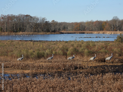 © Scenic Corner, Obraz premium Sandhill cranes, enjoying a peaceful winter day, within the wetlands of the Bombay Hook National Wildlife Refuge, Kent County, Delware.
