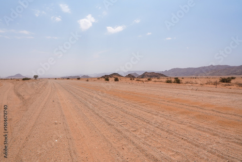 Obraz premium Sandpiste als Strasse quer durch die weiten Wüsten von Namibia im Namib Gebiet