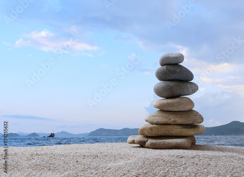 © meepoohyaphoto, Fototapeta premium Sandstone are stacked into a pyramid shape on sea and cloud background and copy space.