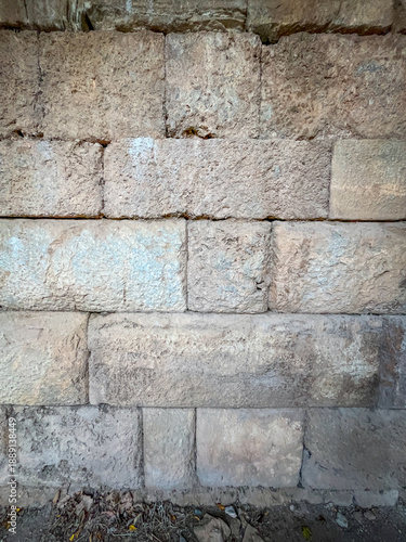 © byerenyerli, Fototapeta premium Sandstone Blocks Stack into Weathered Wall Under Soft Daylight