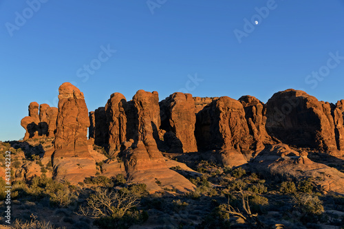 Naklejka premium Sandstone formation at sunset with moon visible. Arches National Park, Utah,USA.