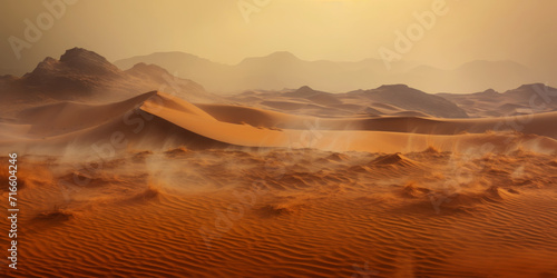 © AngrySun, Naklejka premium Sandstorm in desert. wind and orange sand clouds. Dunes landscape. Generative AI