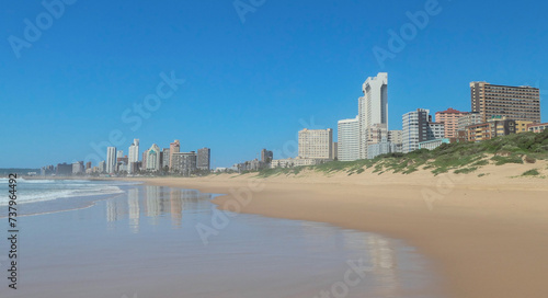 © Mathis, Obraz premium Sandstrand am Indischen Ozean und die Skyline von Durban in Südafrika
