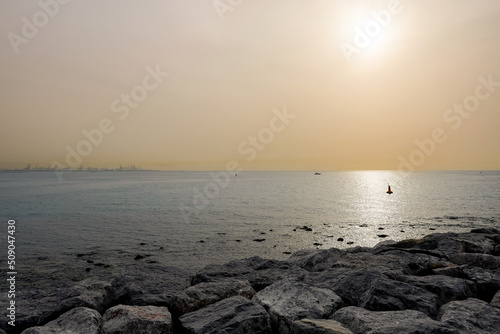 Fototapeta premium Sandsturm über Meer in Dubai. Gelber Himmel voller Sand