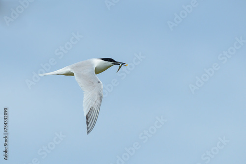 Obraz premium Sandwich Tern, Sterna sandvicensis, with a single sand-eel sandeel sand eel in its beak, against a pale blue hazy sky.
