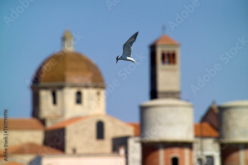 © antasfoto, Fototapeta premium Sandwich Tern (Thalassaeus sandvicensis), Tern in flight, the cathedral in the background. Cabras, OR, Sardinia. Italy