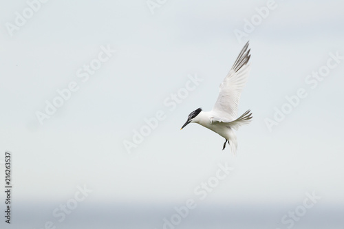 Fototapeta premium Sandwich tern (Thalasseus sandvicensis) in flight, near breeding colony
