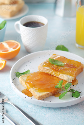 Fototapeta premium Sandwiches with marmalade, orange juice and coffee ready for breakfast