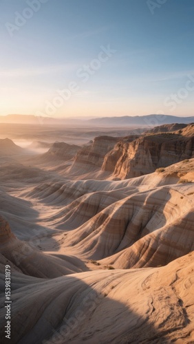 © tourinn, Naklejka premium Sandy Badlands at Dawn with Soft Lighting and Layered Formations