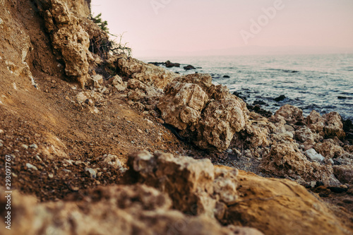 © Rychko Yevhen, Fototapeta premium sandy beach and sea at sunset in the summer