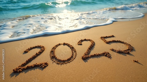 Fototapeta premium Sandy beach numbers mark the arrival of a new year by the serene waters of...