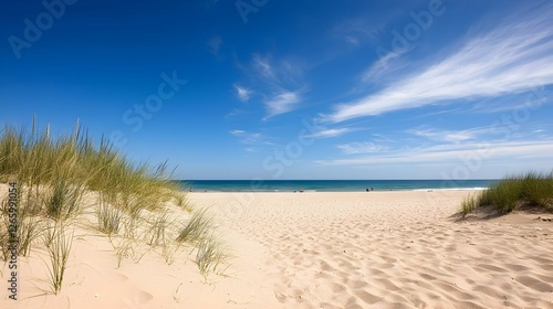 © artzone, Fototapeta premium Sandy Beach Path With Green Dune Grass Under Blue Sky