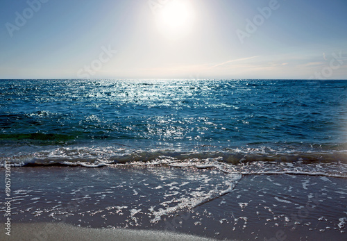 Obraz premium Sandy beach with blue sky and turquoise water ,as holiday summer background.