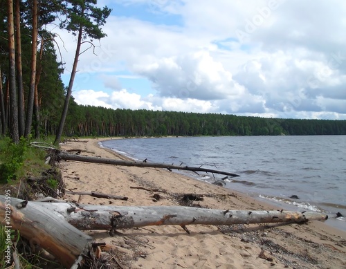 © Tanjungg, Fototapeta premium Sandy beach with driftwood, pine forest, lake and sky