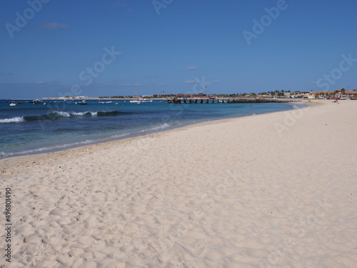 © Jakub Korczyk, Obraz premium Sandy beach with pier on Atlantic Ocean at Sal island, Cape Verde