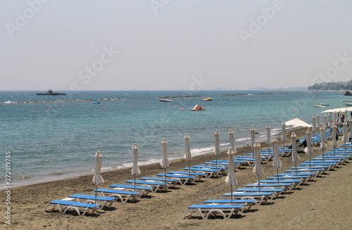 © Olga, Fototapeta premium Sandy beach with sun beds and umbrellas