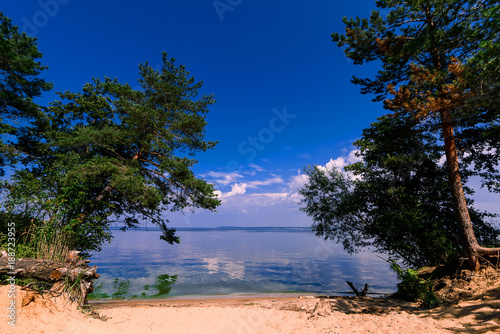 © alexkoral, Obraz premium sandy beach with trees growing on shore against blue sky and water during summer vacation
