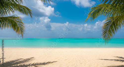 © Chompoo, Obraz premium Sandy Beach with Turquoise Water and Palm Trees in Tropical Paradise Under Clear Blue Sky