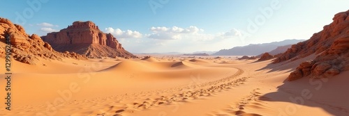 Naklejka premium Sandy dunes stretching towards rocky outcrops, rocky terrain, rock formations