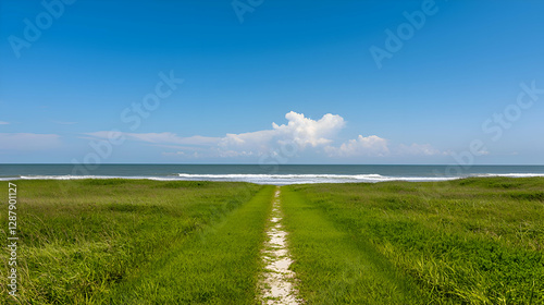© Robin, Obraz premium Sandy Path Through Beach Grass Leading to Ocean Under Blue Sky