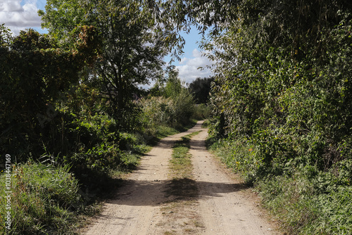 Naklejka premium Sandy road through a meadow. Bushes line the path. Summer hike in nature. Peaceful escape far from the city. Walking activity countryside landscape background. Outdoor summer park. Rural scenic view.