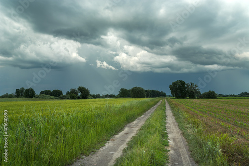 © darekb22, Fototapeta premium Sandy road through green fields and rainy sky