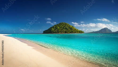 © Rendy Dastian, Fototapeta premium Sandy tropical beach with island on background
