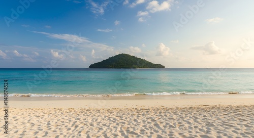 Fototapeta premium Sandy tropical beach with island on background.
