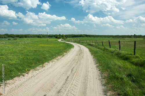 Fototapeta premium Sandy winding road through green pastures, wooden posts in the fence