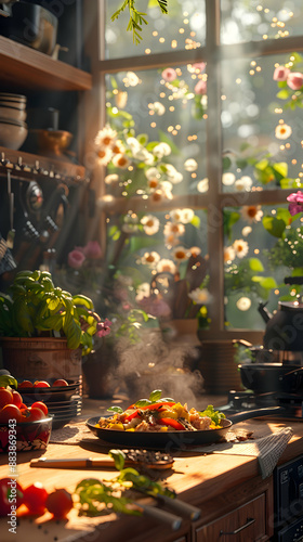 © HaJung, Fototapeta premium Sanitized Cooking Area with ISO Certification and Badge on Whimsical Background for Cleanliness Stock Photo Concept