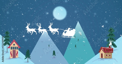 © vectorfusionart, Naklejka premium Santa and reindeer flying over snowy mountains image with moon in background