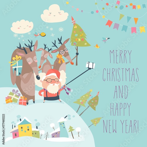 Fototapeta premium Santa and reindeers take a selfie