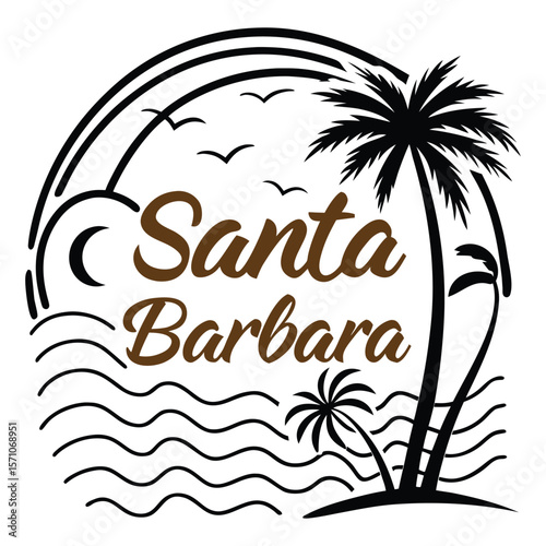 © Shohan, Naklejka premium Santa Barbara Beach Scene Logo with Palm Trees, Ocean Waves, Flying Birds, and a Sunset Backdrop.