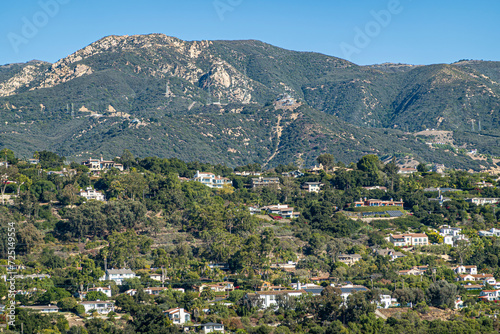 © Klodien, Fototapeta premium Santa Barbara, CA, USA - November 30, 2023: Santa Barbara County Courthouse lookout tower view on Riviera mansions on green hill flank with Santa Ynez mountains and blue sky