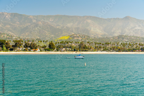 Obraz premium Santa Barbara Seashore o poranku. Łódź na wodzie, piękna plaża z palmami i góry na horyzoncie