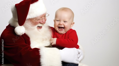 Obraz premium santa claus and a baby seating on his thigh, looking at each other and laughing, happy ambiance, white background