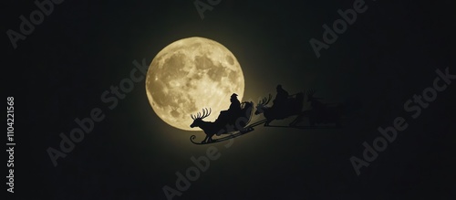 Fototapeta premium Santa Claus and his reindeer flying in front of a full moon in a dark night sky.