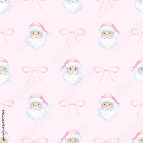 © Мария Ронина, Fototapeta premium Santa Claus, bow. Watercolor seamless pattern in pastel colors. Cute cartoon illustration for textile and paper for Christmas