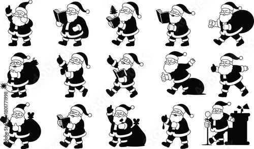 Fototapeta premium Santa, Claus, cartoon, character, Christmas, holiday, festive, silhouette, icon, vector, illustration, gift, joy, winter, celebration, pose, action, design, CAD, drawing, flat