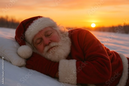 Obraz premium Santa Claus catching peaceful sleep on a white pillow in fresh snow during a vibrant winter sunrise, representing holiday rest