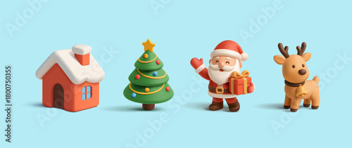 Fototapeta premium Santa Claus, Christmas tree, deer, snowy house, 3D. Minimalistic set of icons...