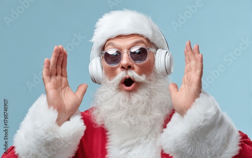 Obraz premium Santa Claus dances with surprise wearing stylish sunglasses and headphones against a blue backdrop in a festive celebration moment