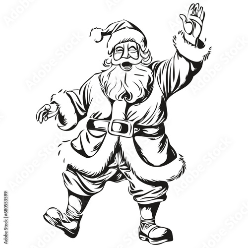 Fototapeta premium Santa Claus dancing Hand-Drawn Cartoon Drawing Detailed Christmas Illustration, Classic Style, black white isolated Vector ink outlines template for greeting card, poster, invitation, logo