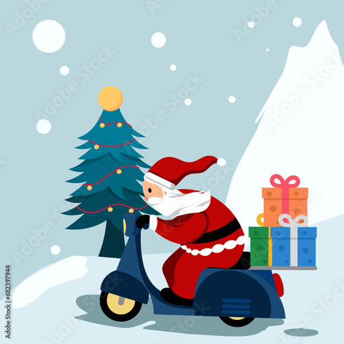 © rfxii_ofiicial, Fototapeta premium Santa Claus delivering Christmas gifts on a scooter.Isolated elements easy to use. New Year and holiday design. Vector illustration.