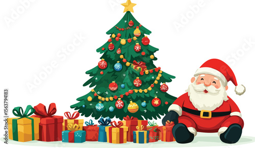 Fototapeta premium Santa Claus delivers festive Christmas gifts by a decorated tree in the...