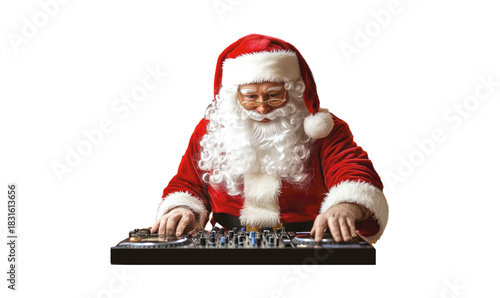 Obraz premium Santa Claus dj mixing music on turntable in festive holiday setting isolated...
